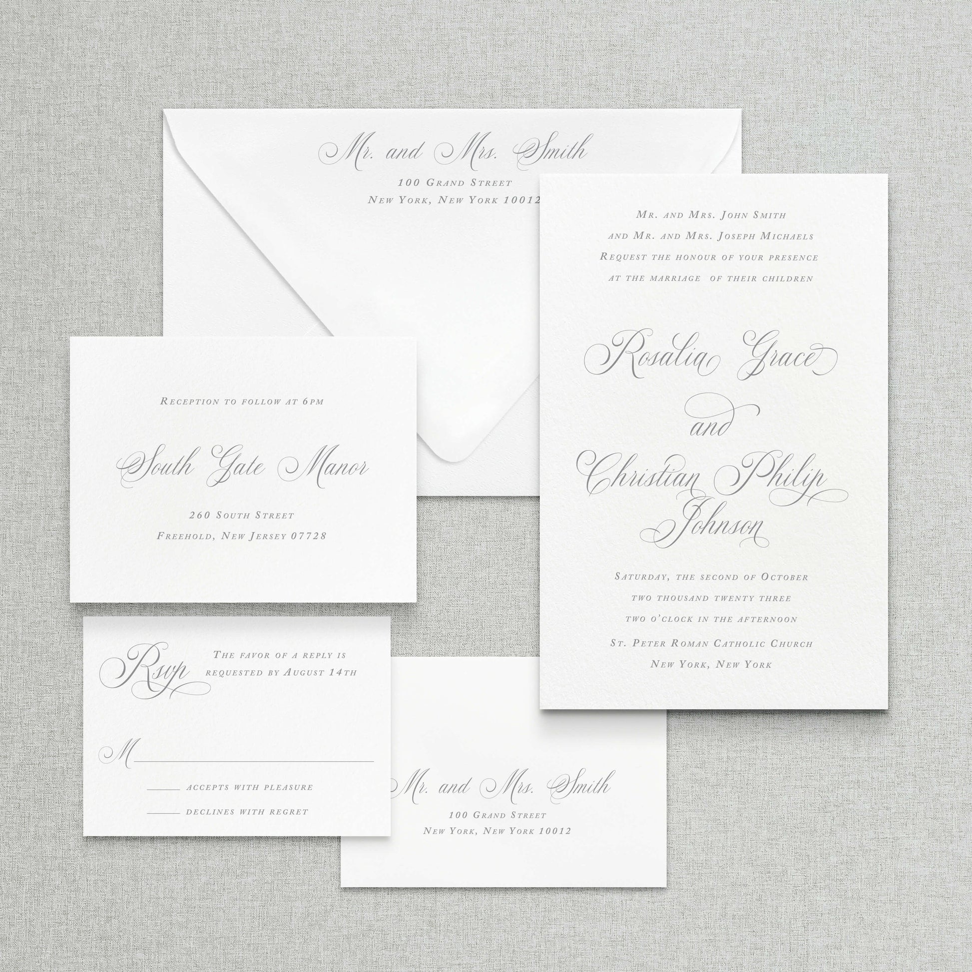 - Complimentary return & RSVP address printing (white/off-white envelopes only)