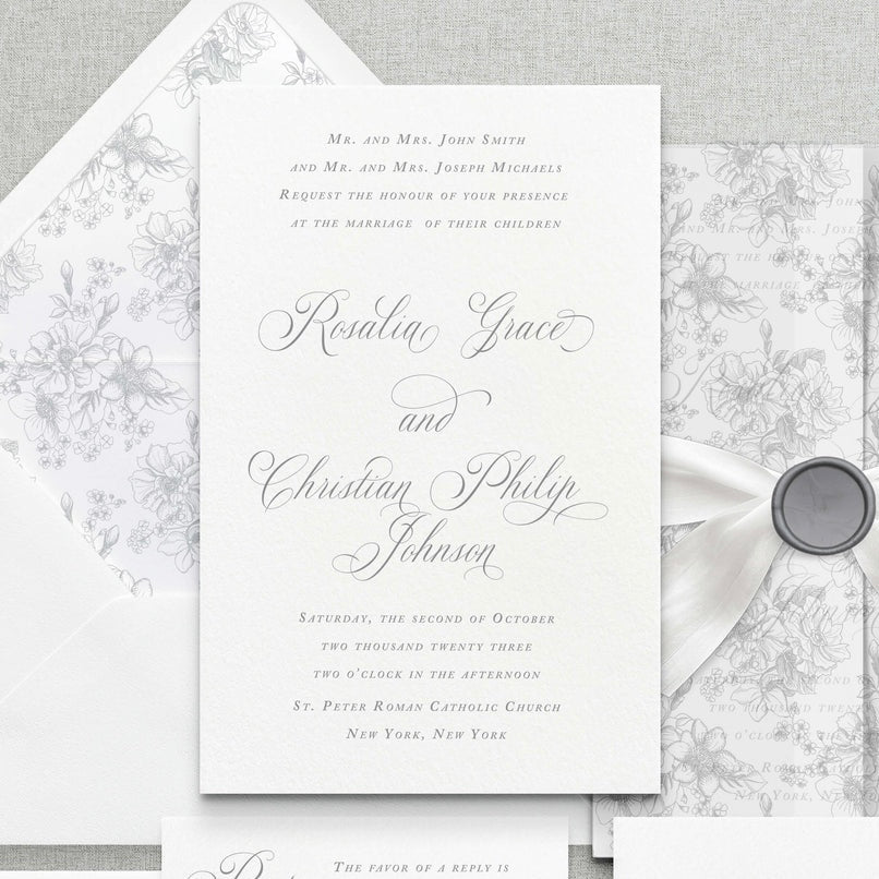 Grace: A timeless embrace of refined elegance and classic beauty. With delicate floral motifs in gray and white, these invitations are the perfect choice for a soft, formal, and traditional celebration.